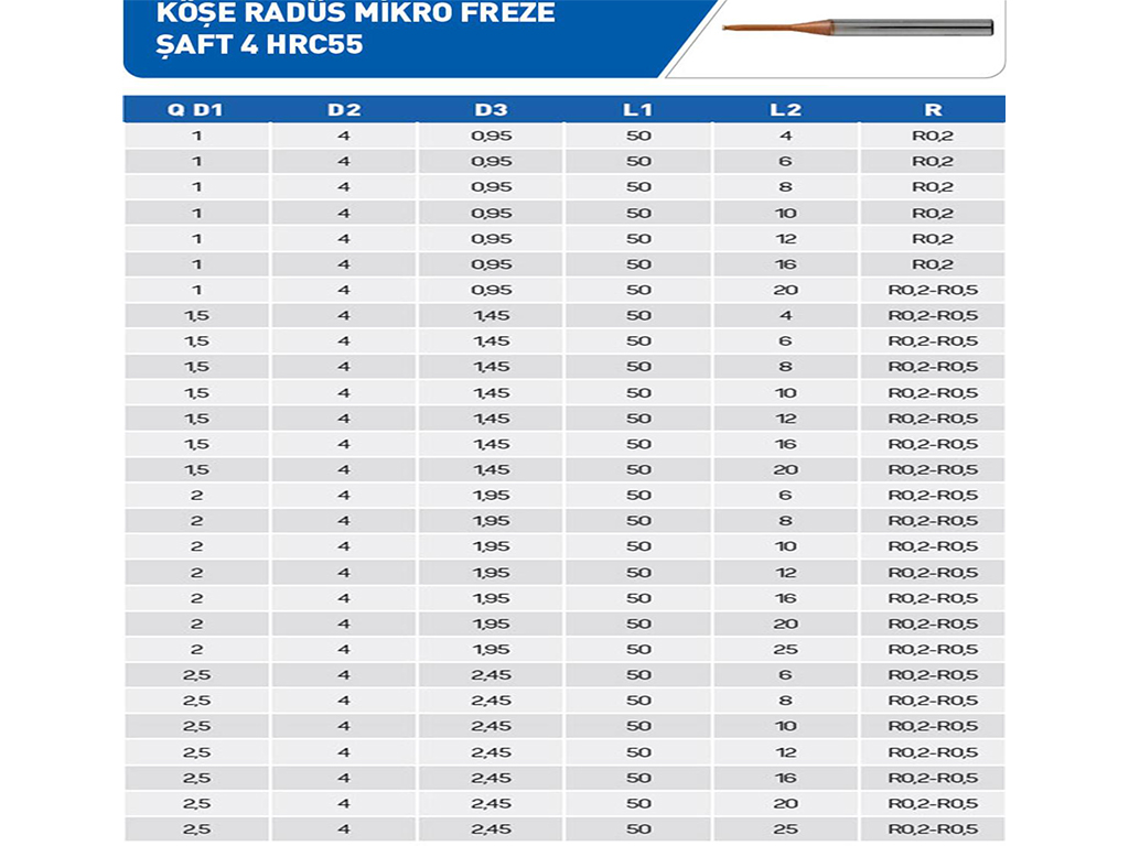 KÖŞE RADÜS MİKRO FREZE ŞAFT 4 HRC55